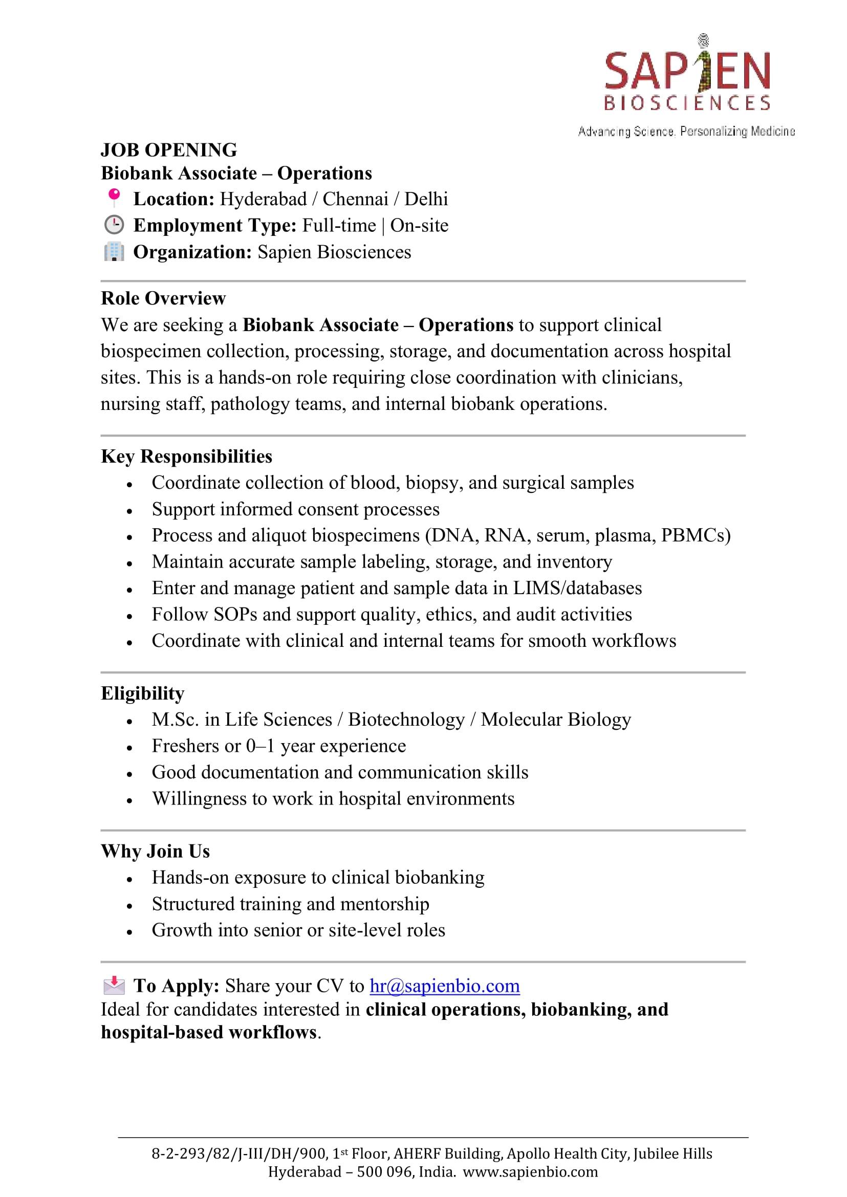 - Biobank Associate at Hyderabad, Chennai, Delhi